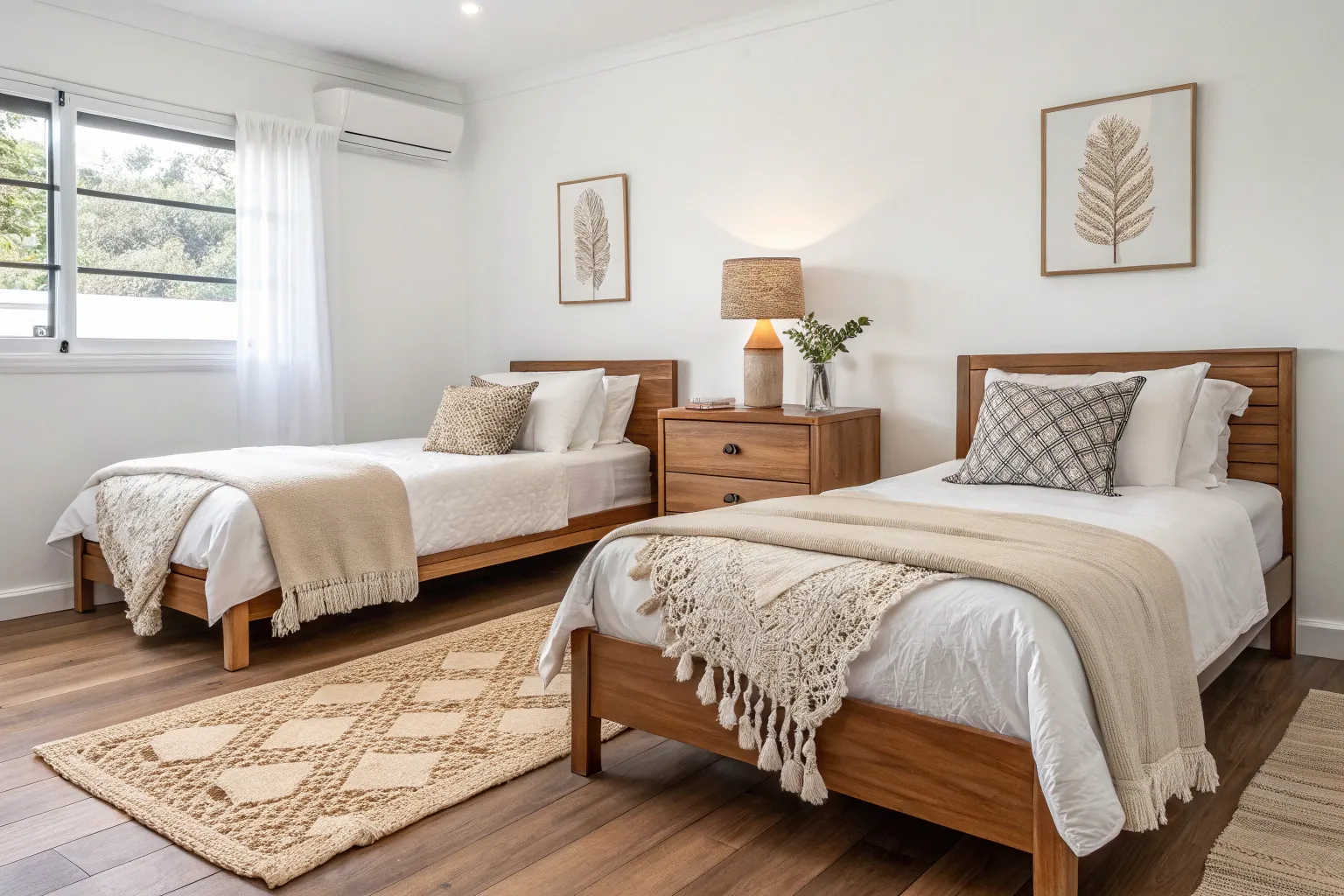 • Textured Throw Blankets: Drape soft, neutral throws over the foot of each bed to add cozy layers and cohesive style.