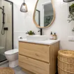 • Floating Wooden Corner Shelf: Maximize your bathroom’s potential by turning unused corners into stylish storage for decor and daily essentials.