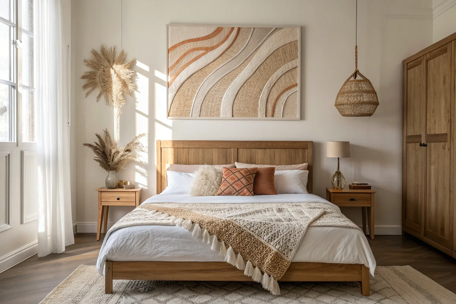 A cozy woven basket cluster above the bed—minimal, boho, and beautifully textured.
