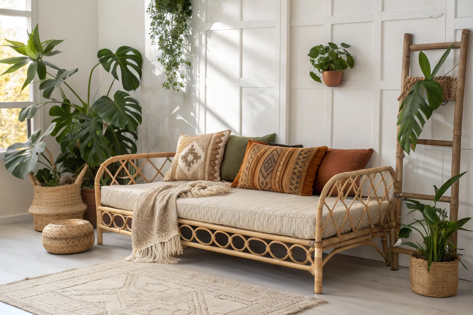 - Rattan Daybed Frame: Anchor your sunlit corner with a natural rattan frame that brings instant boho warmth to any room.