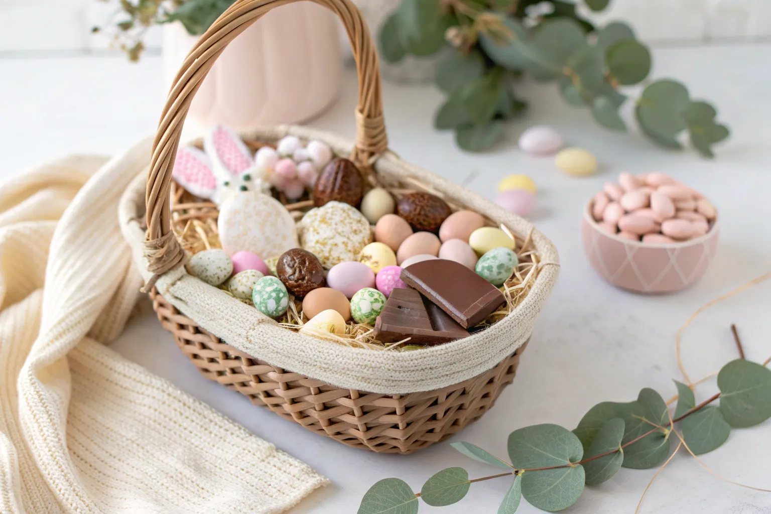 Embrace nature’s elegance with a minimalist Easter basket filled with leafy candies and edible blooms.