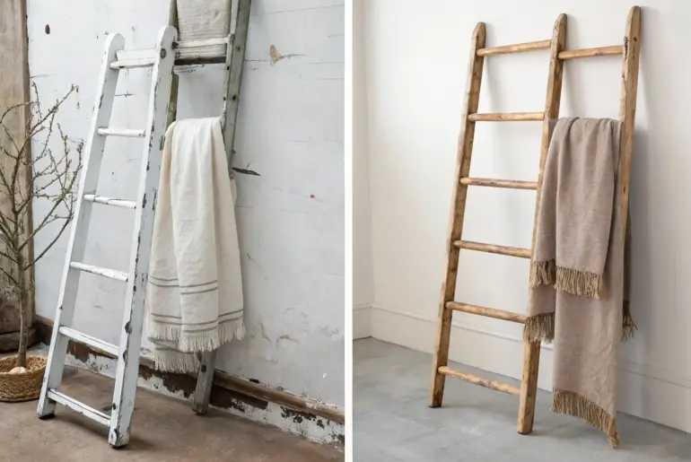 Repurposing is my favorite small-space superpower because it turns everyday “junk” into something you actually use and want to display. Old Ladder as a Vertical Towel Rack Old wooden ladder turned vertical towel rack—beautiful, space-saving storage for small baths. I leaned an old wood ladder against my bathroom wall and repurposed it as a towel rack that takes up almost zero floor space. In my last studio, it doubled as a spot for hanging baskets…