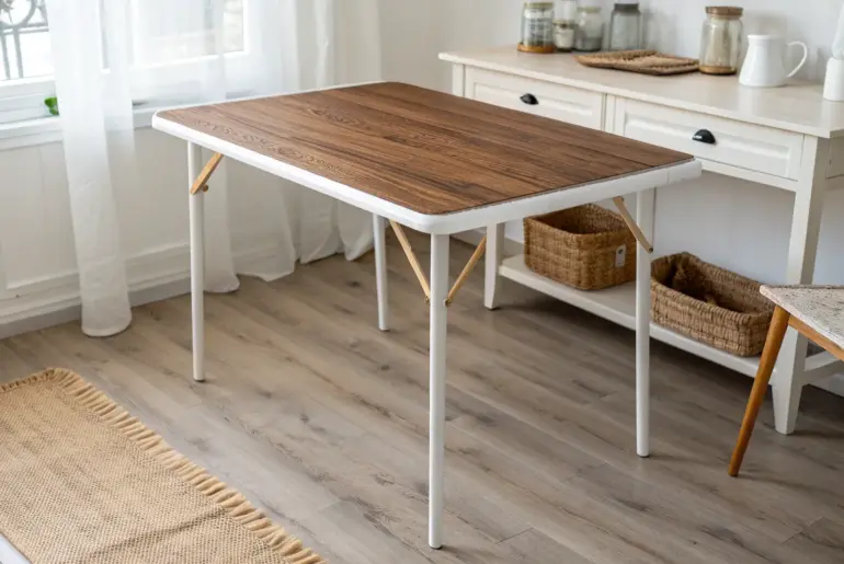 A basic folding table is super handy, but it doesn’t have to scream “temporary.” In my tiny apartments, I’ve learned a few easy upgrades that make a folding table look polished enough for everyday dining, working, or decorating. Create a Two-Tone Statement Finish Two-tone paint instantly upgrades a folding table—dark base, light top for a designer look. A folding table can look designer-ish with a two-tone approach—like a dark base and a lighter top—so it…
