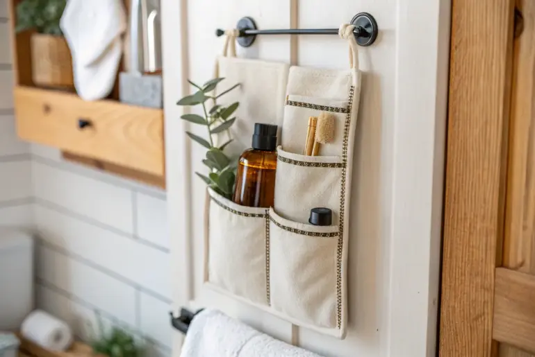 An RV bathroom can go from cute to chaotic fast, especially once you hit the road and everything starts shifting. Use Over-the-Door Pocket Storage Deep-pocket over-the-door organizer keeps RV bathroom essentials secure and counter-free. In my RV bathroom, I hang a slim over-the-door organizer on the inside of a cabinet door to stash lotion, hair stuff, and backup toothpaste without touching the counter. I learned the hard way that deeper pockets keep items from launching…