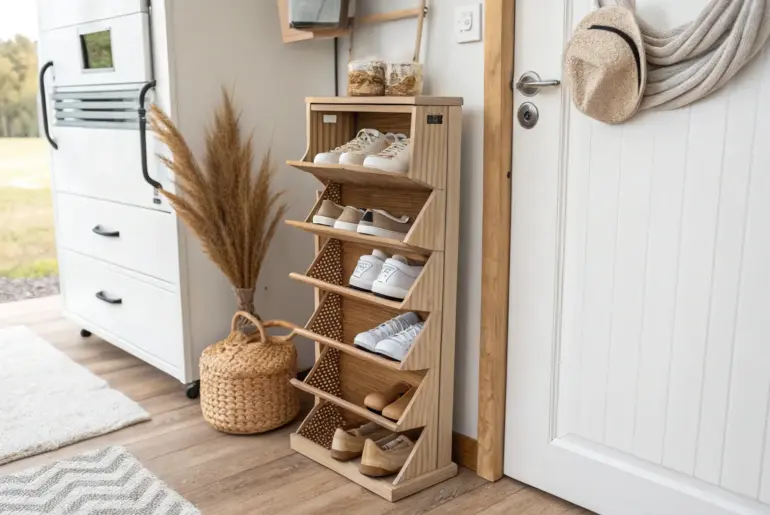 In an RV, shoes can take over the entry in about two seconds flat, and suddenly you’re doing acrobatics just to get inside. These RV shoe storage ideas are the ones I’ve used (or set up for clients) to keep floors clear, traffic flowing, and the whole rig feeling calmer. Over-the-Door Pocket Organizer Over-the-door pocket organizer: the fastest way to keep RV shoes off the floor. I hang a shoe pocket organizer on the inside…