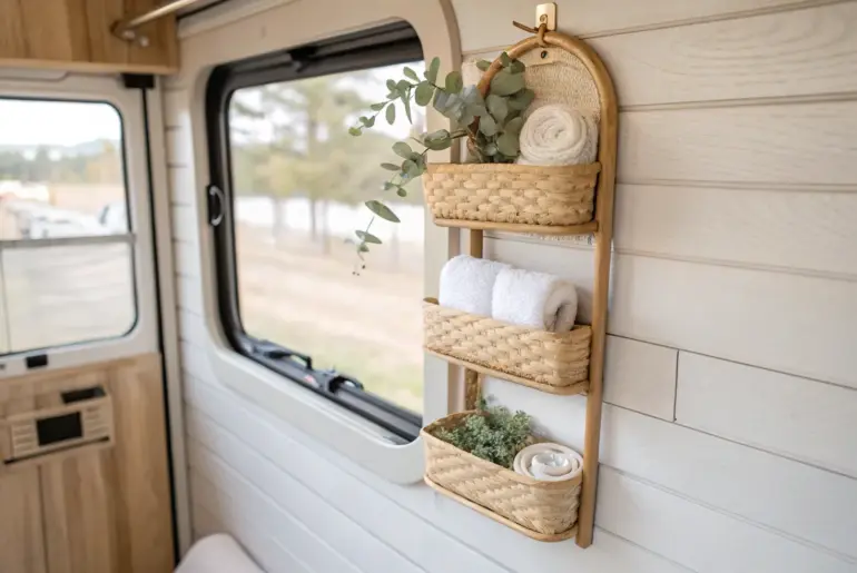 An RV bathroom can go from cute to chaotic fast, especially once you hit the road and everything starts shifting. Use Over-the-Door Pocket Storage Deep-pocket over-the-door organizer keeps RV bathroom essentials secure and counter-free. In my RV bathroom, I hang a slim over-the-door organizer on the inside of a cabinet door to stash lotion, hair stuff, and backup toothpaste without touching the counter. I learned the hard way that deeper pockets keep items from launching…