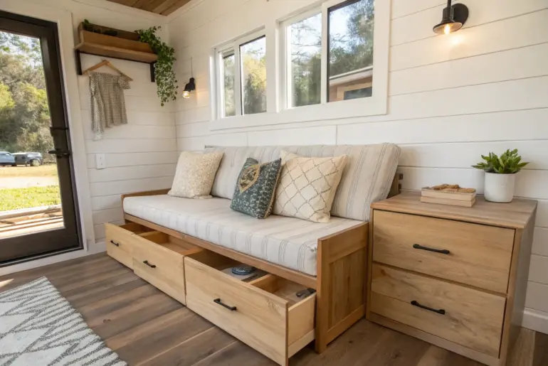 In a tiny house, the right furniture isn’t just decor—it’s basically your floor plan in disguise. Window Seat With Hidden Compartments Tiny-house window seat: a sunny reading nook with hidden storage you’d never guess. I built a little window seat vibe in a past rental using a storage bench, and it became everyone’s favorite spot to sit. In a tiny house, window nook seating doubles as a bright reading corner and a sneaky storage solution.…