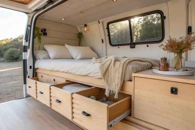 Your camper van bed is the one feature you’ll use every single day, so it deserves a little extra brainpower up front. Pop-Top Roof Bed for a Second Sleeping Level A pop-top roof bed adds a second sleeping level—freeing the main floor for storage and seating. A pop-top bed creates an entire extra sleep zone without consuming your main floor plan, which is such a clever small-space move. I’ve always loved how it keeps the…