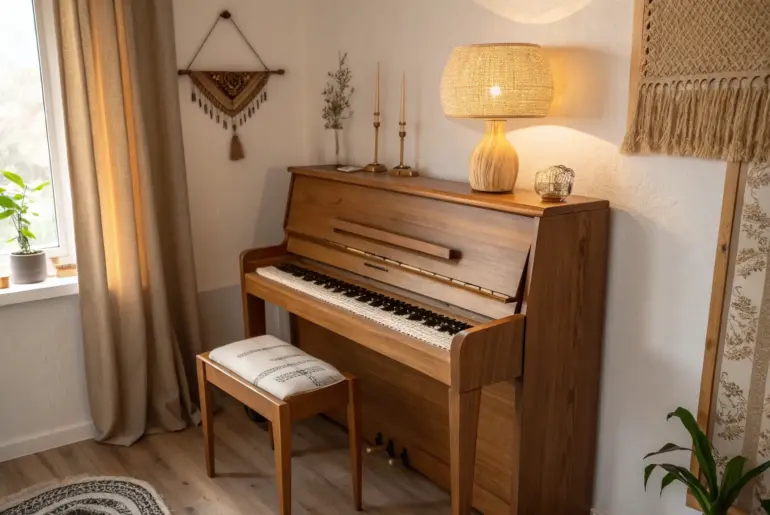 A cozy small piano room doesn’t need to be a separate, fancy space—it can be a sweet little corner that fits right into your everyday life. Build Vertical Shelves for Sheet Music Go vertical with slim wall shelves to store sheet music and make a tiny piano room feel airy. I installed wall shelves above and beside my piano so I could store music books upward instead of piling them on the bench. That little…