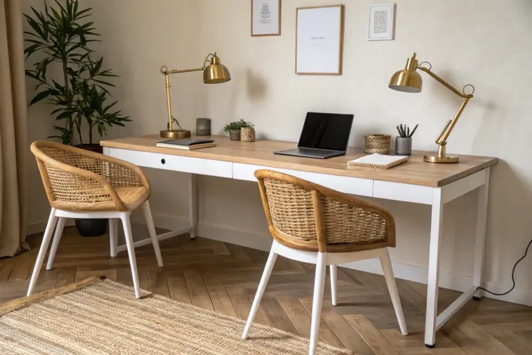 Sharing a home office can feel tricky when you both need focus, storage, and a setup that looks good on camera. In my tiniest apartments, the secret was always a smart layout for two people first, then the pretty styling second. Symmetrical Side-by-Side Stations Symmetrical side‑by‑side workstations that make a shared office feel calm, even in small spaces. My favorite “it just works” trick is matching the basics on both sides—same chair style, same shelf…