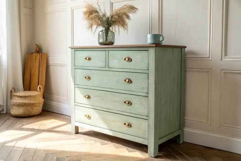 A painted chest of drawers is one of my favorite small-space upgrades because it gives you major style without adding any extra furniture. Two-Tone Frame and Drawer Fronts Two-tone painted dresser: deep frame + light drawer fronts for an instant custom look. One of the easiest upgrades I’ve done is a two-tone painted chest of drawers—darker on the frame, lighter on the drawer fronts. In my studio, that contrast made a thrifted piece look custom…