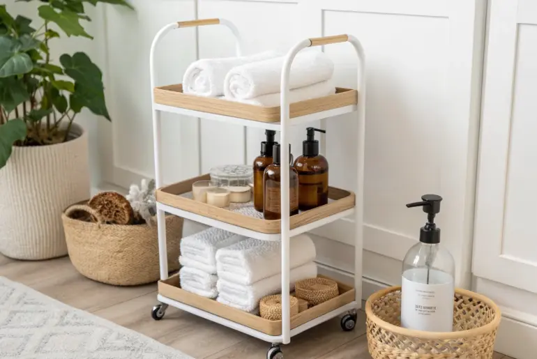 A good bathroom cart can feel like extra cabinetry you didn’t have to install, especially in a small bathroom. I’ve relied on rolling cart setups in tiny apartments for years to keep daily essentials within reach while still looking calm and spa-like. Guest-Ready Essentials Cart A guest-ready bathroom cart: fresh towels, travel minis, and a simple toothbrush cup—so welcoming. For overnight guests, I roll in a bathroom cart with guest toiletries like fresh towels, a…