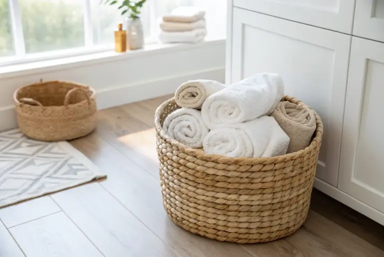 A good towel basket can make even the smallest bathroom feel instantly calmer and more pulled together. Corner Basket Near the Tub Spa-like corner towel basket by the tub—rolled towels, woven texture, zero clutter. I keep a round towel basket in the corner by the tub and fill it with rolled towels so it feels spa-like without taking up much walking space. These products might be useful: Round Woven Rope Basket: Choose a sturdy rope…