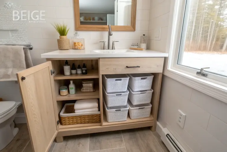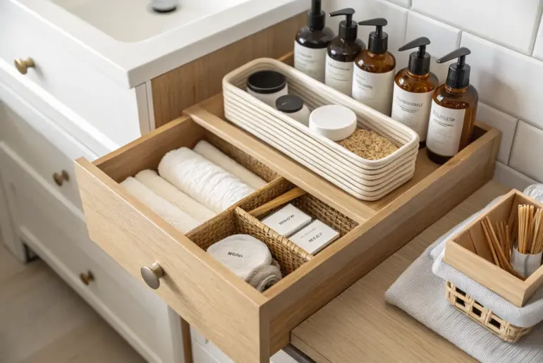 Bathroom vanity clutter has a sneaky way of multiplying overnight, especially in a small bathroom. These ideas focus on what actually works inside drawers and cabinets so your everyday routine feels easy and calm. Work Around Plumbing With a U-Shaped Layout Turn awkward under-sink pipes into a divider with slim U-shaped bins for a tidy vanity. I treat the pipes like a divider and build a U-shape of slim bins around them so every inch…