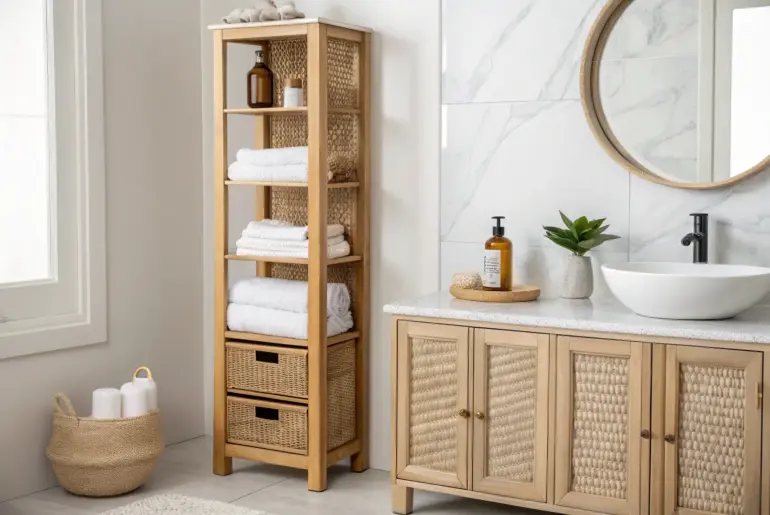 A bathroom vanity tower is my go-to move when a bathroom feels short on storage but you don’t have space to widen the vanity. You get that dreamy vertical storage moment—without giving up precious floor space. Glass-Front Upper Section for a Light Feel Glass-front vanity tower brightens a dark bath—display pretty towels and bottles up top. In a darker bathroom, I’ve used a vanity tower with a glass-front top to keep the wall from feeling…