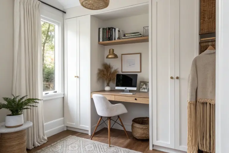 A closet desk is one of my favorite small-space tricks because it gives you a real work zone without stealing precious floor space. With a few smart tweaks, even a basic closet can turn into a cozy, good-looking mini office you can actually keep tidy. Remove the Closet Doors for an Open Nook Remove closet doors to create an airy built-in desk nook—tiny space, big impact today. The quickest closet desk upgrade is taking off…