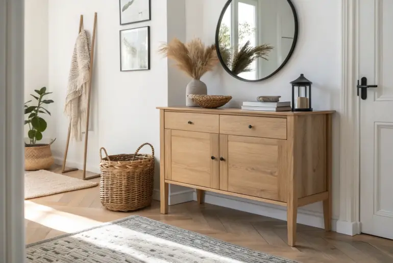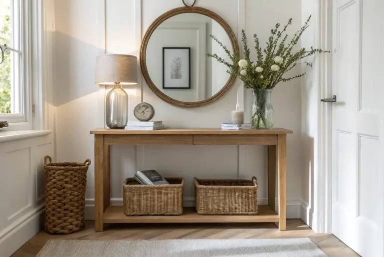 A small entrance hall can feel like a bottleneck fast, but it’s also your home’s first chance to feel calm and put-together. Use a Shoe Bench With Hidden Storage A sleek shoe bench with hidden storage keeps even the smallest entry calm and clutter-free. The day I added a shoe bench was the day my hallway stopped looking messy. I love having a place to sit and a spot for shoe storage that doesn’t scream…