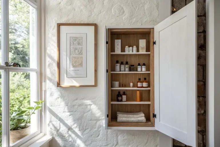 A hidden medicine cabinet is my favorite way to get bathroom storage without staring at a “storage solution” all day. If you’re working with a tiny bath (or a rental), these ideas help you tuck the clutter away while keeping things looking calm and styled. Tiled Wall Cabinet With a Push Latch A tiled push-latch cabinet that disappears into the wall—sleek storage for tiny bathrooms. For a seamless look, you can tile the cabinet face…