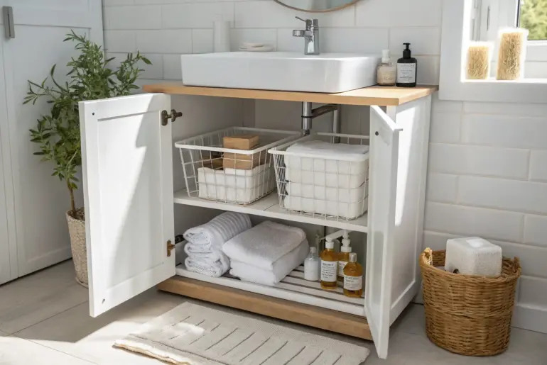 Under-sink cabinets are basically the Bermuda Triangle of cleaning supplies, especially when you’re working around bulky pipes and weird corners. Do a Full Reset and Make Zones Reset your under-sink with one pull-out organizer—three calm zones: daily, dish, backups. Whenever I organize under a sink, I pull everything out and set up simple zones (daily cleaners, dish stuff, backups), because otherwise it all turns into one big pile again. In my first studio, this one…