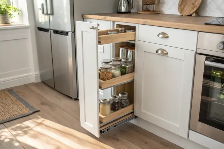 Kitchen gaps are basically tiny black holes where crumbs, drips, and random utensils go to disappear. In my small apartments, filling those skinny spaces has been one of the easiest ways to make the whole kitchen feel cleaner, calmer, and way more functional. Slide-Out Spice Rack Insert A slim slide-out spice rack turns a tiny stove-side gap into a chic, easy-to-grab pantry. I installed a slide-out spice rack in a narrow dead zone next to…