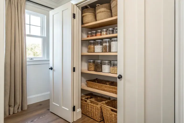 Turning a basic closet into a pantry is one of my favorite small-space upgrades because it instantly clears your counters and calms the kitchen chaos. I’ve done this in multiple tiny apartments, and the right setup makes even a shallow reach-in feel roomy and intentional. Create Simple Pantry Zones A simple “Snacks” basket creates a kid-eye-level pantry zone and prevents duplicate buys. I always set up pantry zones like baking, breakfast, snacks, and dinner helpers…