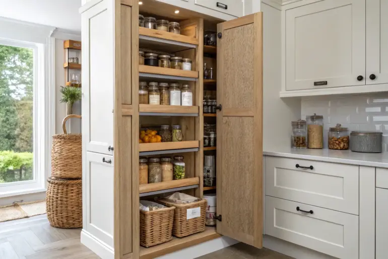 A good wall pantry cabinet can turn “no storage” kitchens into calm, organized spaces without eating up your floor plan. I’ve lived with tiny kitchens for years, and these ideas are the ones that consistently make my pantry feel bigger, neater, and easier to use. Pull-Out Baking and Breakfast Station Pull-out wall pantry cabinet: baking shelf + breakfast zone for effortless small-space mornings. I’ve set up a wall pantry cabinet with a dedicated baking shelf…