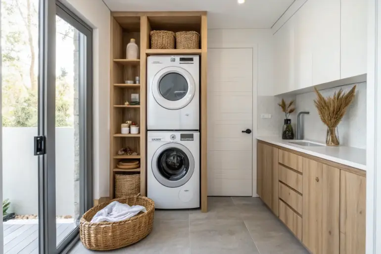 A stacked washer and dryer is my go-to move when a laundry area has more height than floor space. Blend It Into a Bathroom Wall Stacked washer-dryer hidden in a bathroom wall cabinet—warm oak, calm lines, seamless storage. I’ve helped clients place a stacked washer dryer in a larger bathroom, and it’s surprisingly seamless when you add moisture-friendly shelving and a door front. It’s also ridiculously convenient when towels and laundry live in the same…