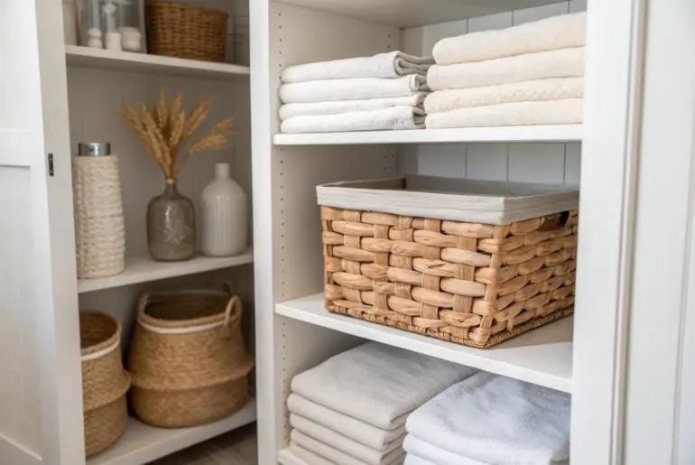 A linen closet feels instantly calmer when the shelves actually match how you live day to day. In my tiny apartments, dialing in the right shelving layout has been the difference between a “stuff avalanche” and a closet that practically runs itself. Add a Header Shelf Above the Door Line A slim header shelf above the door keeps guest linens tucked away and everyday shelves clear. One of my favorite “hidden” upgrades is a slim…