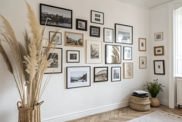 If you’ve got a blank wall and a stack of frames, you’re basically holding the ingredients for instant cozy. Centered Row Above the Sofa A centered, bottom-aligned photo frame row above the sofa for a tidy, finished small-space look. In my 450 sq ft place, I hung a simple photo frame row centered above my sofa, and it made the whole seating area feel “done” without eating up visual space. I always keep the bottoms…