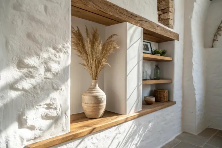 Recessed wall shelves are my favorite small-space trick because they turn “dead” wall cavities into storage without stealing an inch of floor space. I’ve used them in tiny apartments to get the clean, uncluttered look of built-ins—without the bulky furniture. Living Room Built-In Book Niche A wide built-in book niche styled with breathing room for a custom, calm living room wall. A wide recessed wall shelf in my living room held my favorite books and…