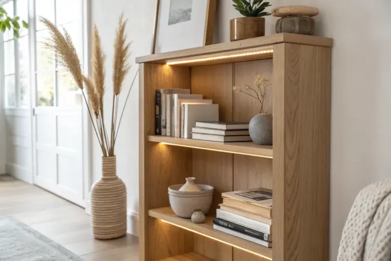 Good bookcase lighting turns everyday shelves into a cozy little focal point, even in the tiniest apartment. Light the Back Panel With a Reflective Finish Reflective back panel + hidden LEDs: double the glow for brighter, layered bookcase shelves. One of my sneaky tricks is pairing bookcase lighting with a light-reflecting back panel (think glossy or metallic) so the glow doubles. I’ve done this behind neutral decor and it instantly made the shelves feel brighter…