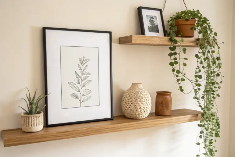Floating shelves are my favorite little “cheat” for making a small space feel styled without adding any bulk. Minimal Shelf With Breathing Room A single handmade vase on a floating oak shelf—minimal styling with calming breathing room. Sometimes the best floating shelf decor is intentionally sparse—one large piece, one small piece, and lots of negative space. I had to learn this the hard way, because in a small space, “just one more thing” turns into…