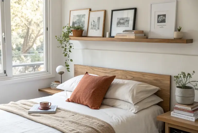 That blank wall over your pillows is basically free real estate, especially when you’re living small. I’ve leaned on a shelf above the bed in every tiny apartment I’ve had to add storage, style, and a cozy focal point without losing an inch of floor space. Shelf Framed by Wall Lights Floating oak shelf framed by twin sconces—instant hotel vibe and no nightstands needed. Pairing a shelf above the bed with two wall lights is…