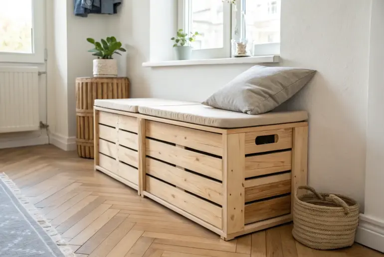 Wooden crates are one of my favorite small-space helpers because they’re cheap, flexible, and somehow always look charming. I’ve used them in nearly every apartment I’ve lived in, and they’ve saved me from so many clutter spirals. Ceiling-Hung Crate Pot Rack A ceiling-hung wooden crate turns pots and utensils into bold, renter-friendly decor. In a rental kitchen with zero cabinets, I hung a wooden crate from the ceiling as a light pot rack and utensil…