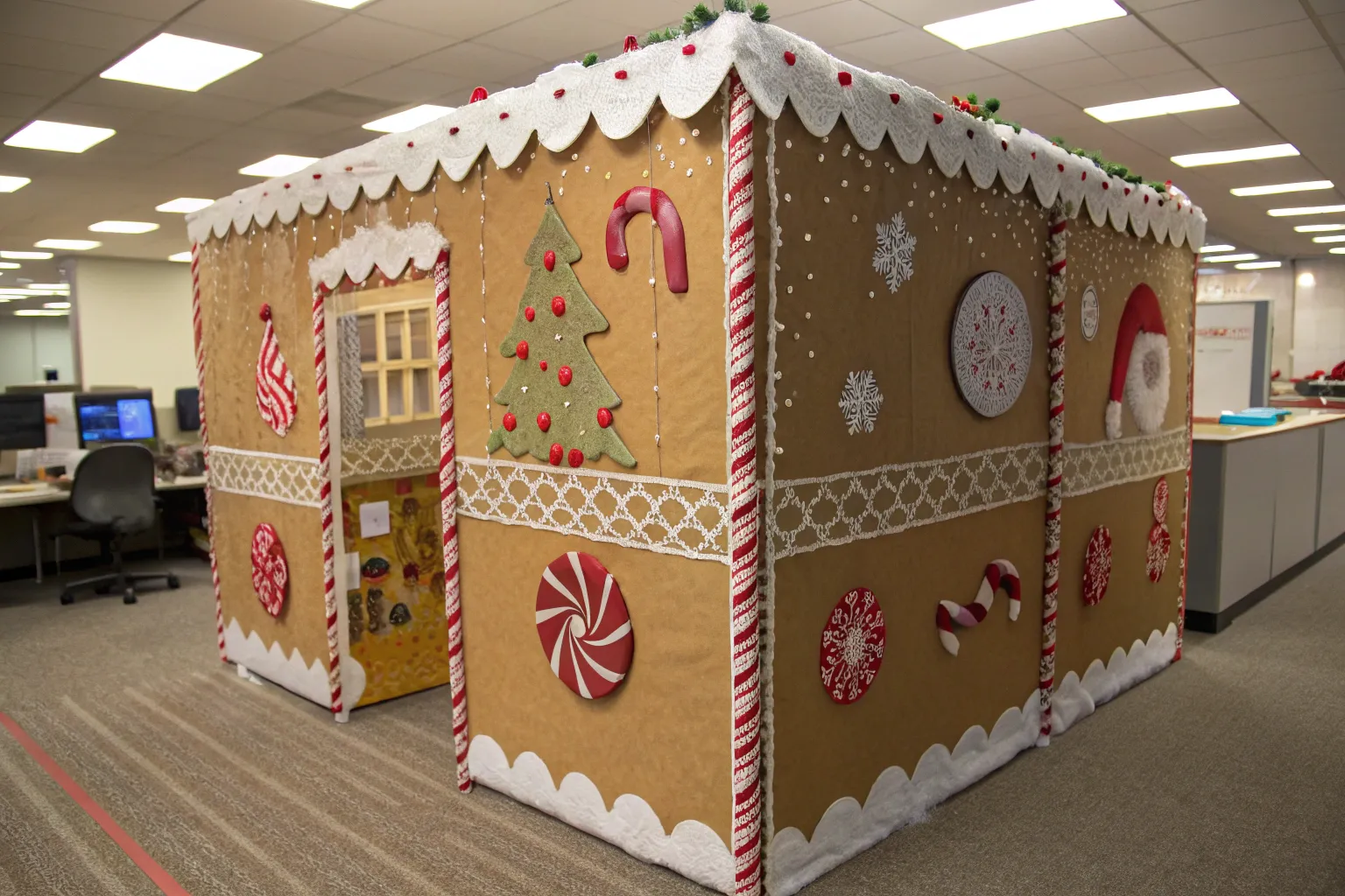 I create a fabric or paper ceiling canopy across the top edges to give my cubicle a cozy “room” feeling, like a little holiday cabin. When I tried it, the enclosed look made the décor feel immersive even with minimal items.