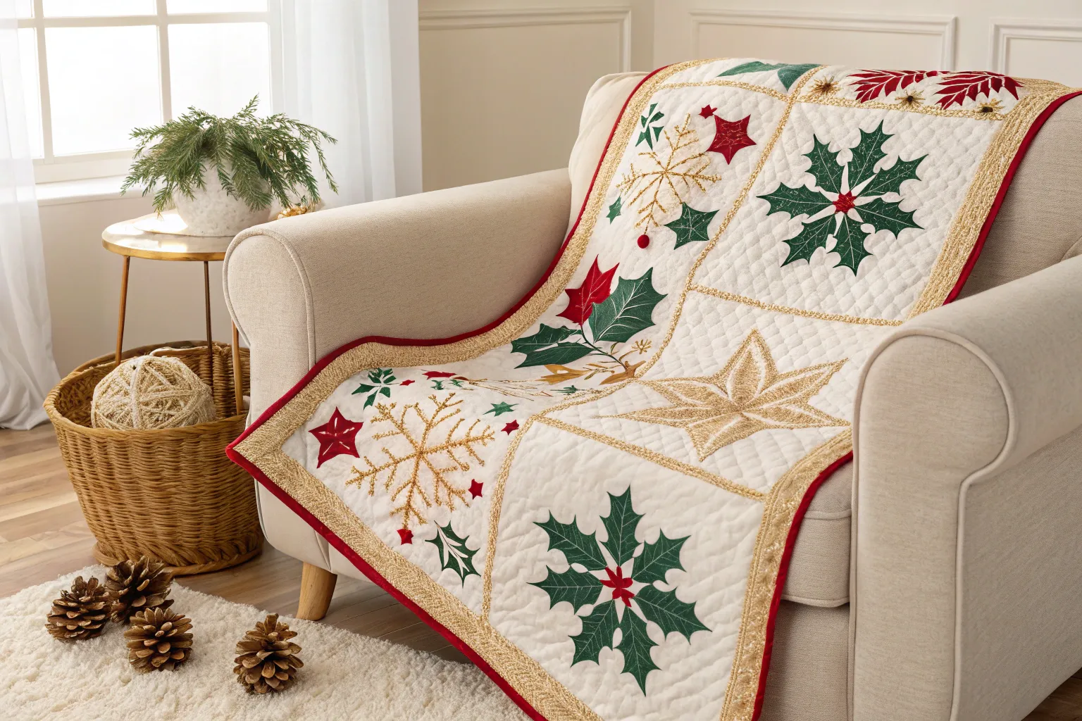 Incorporate holly leaves and berries into your quilt for a traditional touch. This pattern is a lovely nod to classic Christmas decor.