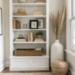 I like to pick 2–3 main colors for my built-in shelf decor (plus a neutral), then stick to that palette so the shelves feel pulled together. When I did this with soft whites, warm wood tones, and one accent color, my shelves instantly looked more “designed” and less busy.
