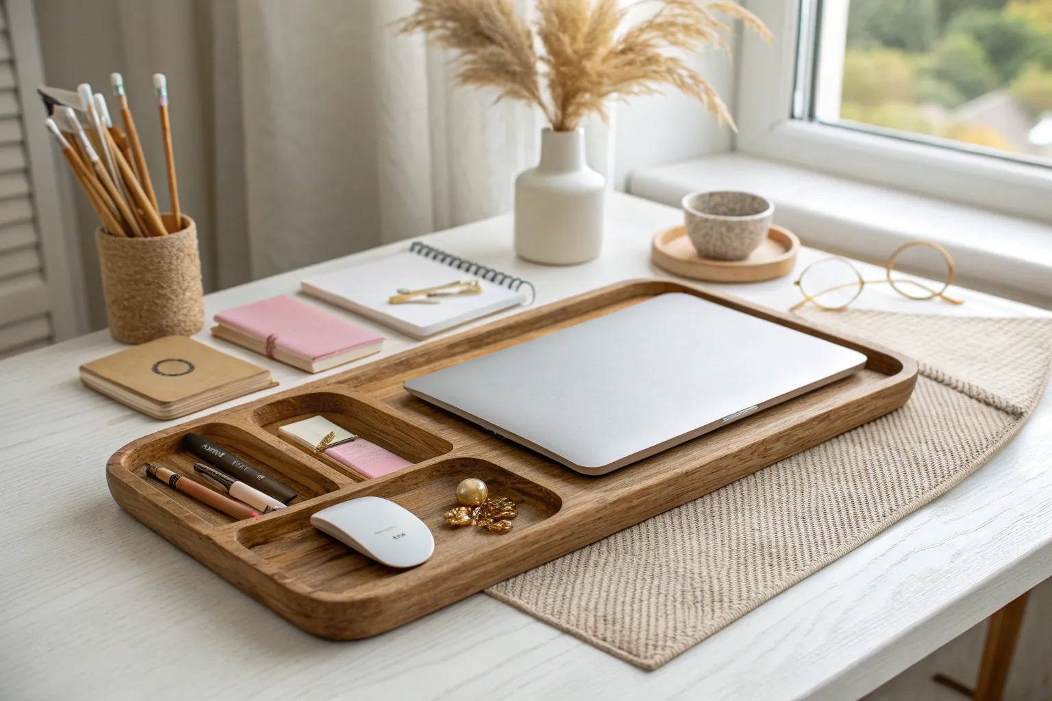 Top-five desktop rule: one beautiful tray keeps essentials close and your workspace airy.