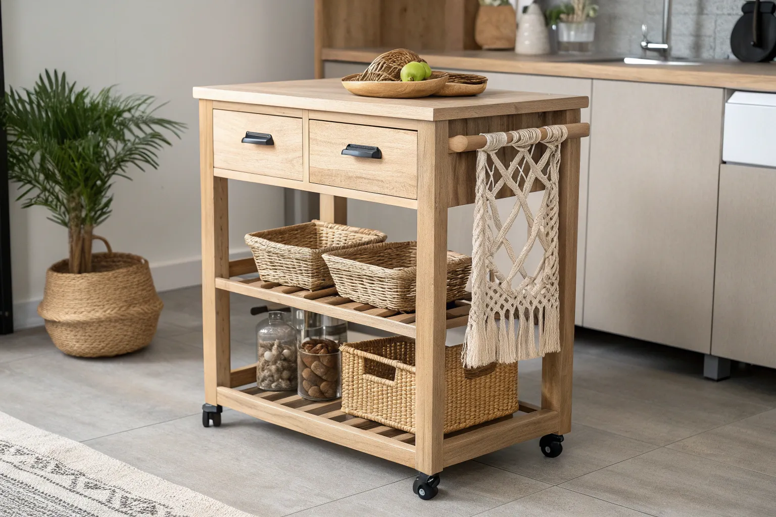 - Rectangular Wicker Baskets: Organize essentials effortlessly with these elegant rectangular wicker baskets on your kitchen cart.