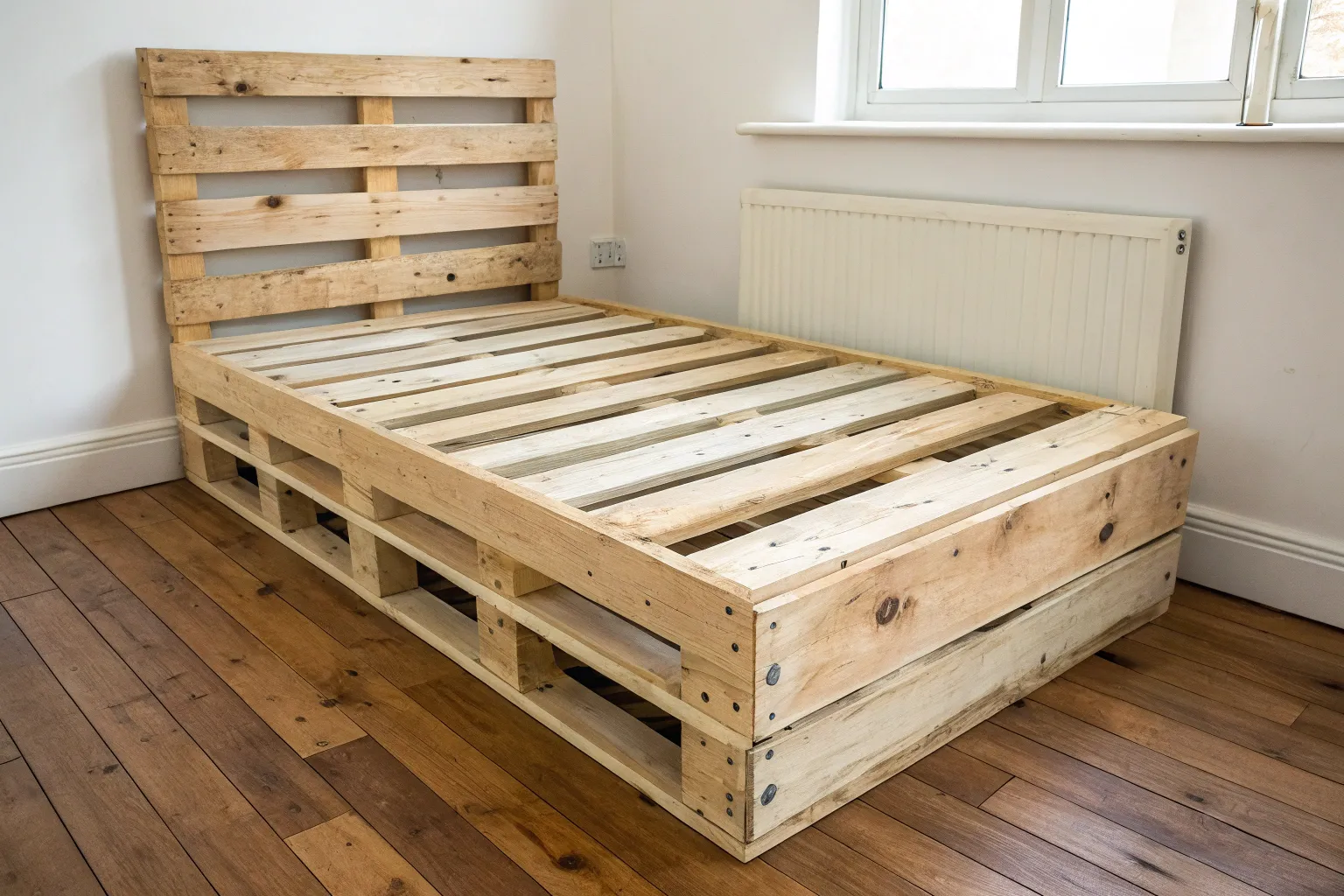 A smooth, splinter-free DIY pallet platform bed that makes a small kids room feel calm.