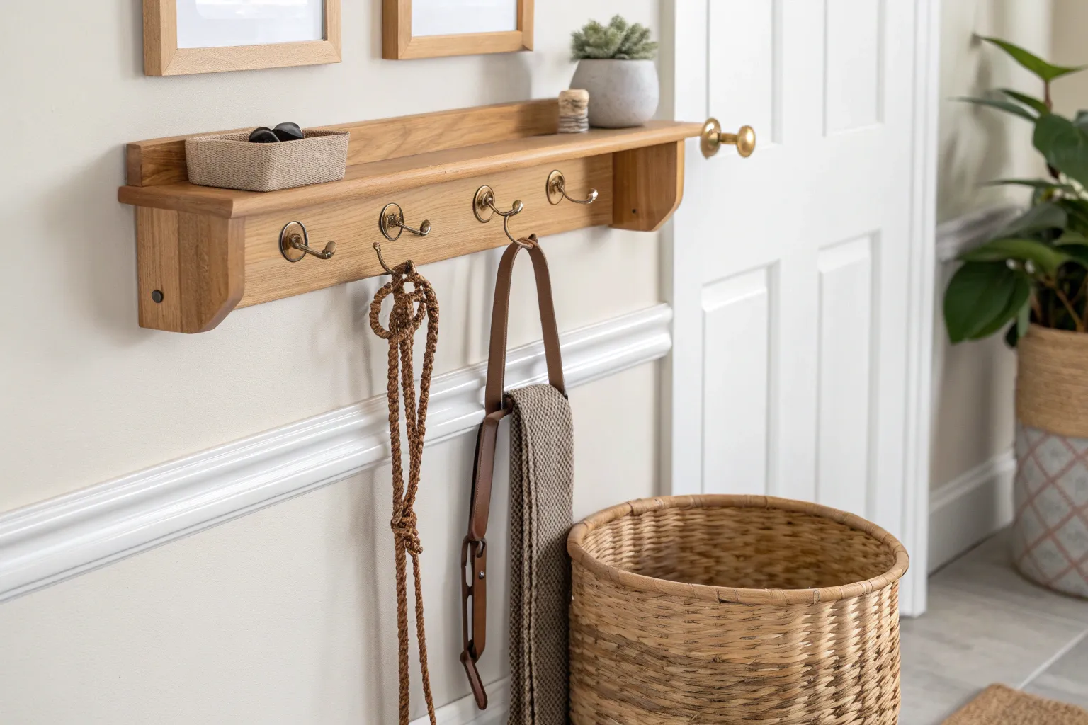 - Wall-Mounted Wooden Hook Rail: Secure this sturdy rail to your closet door to create an instant, designated spot for hanging multiple leashes.