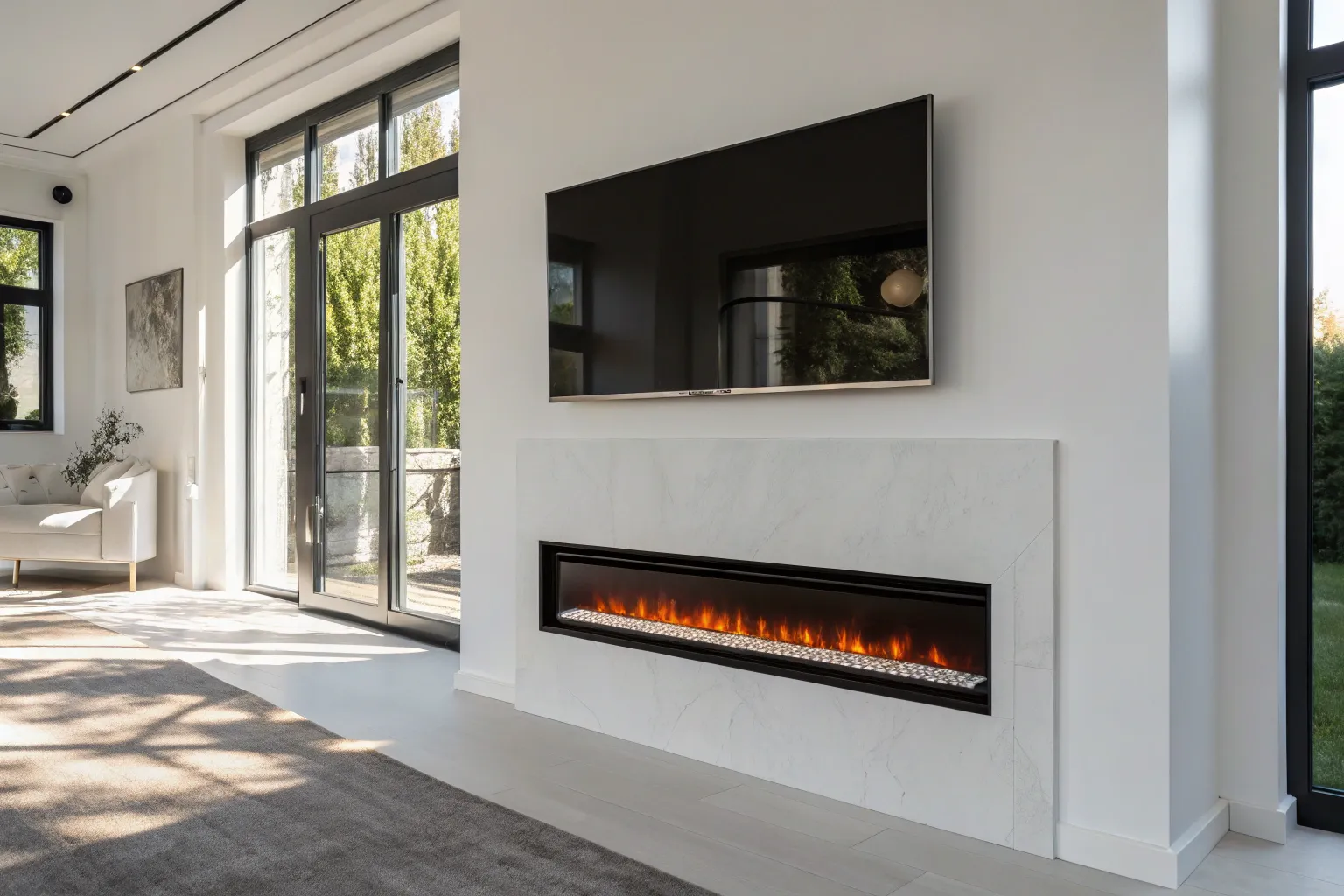 In my 450 sq ft apartment, I mounted a linear electric fireplace under the TV to create one clean media wall focal point. The trick that made it look custom was hiding the cords in a simple cable chase so nothing dangled.