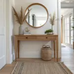 - Jute Hallway Runner Rug: Ground your hallway design with a natural textured runner that echoes the ceiling’s warm, organic tones.