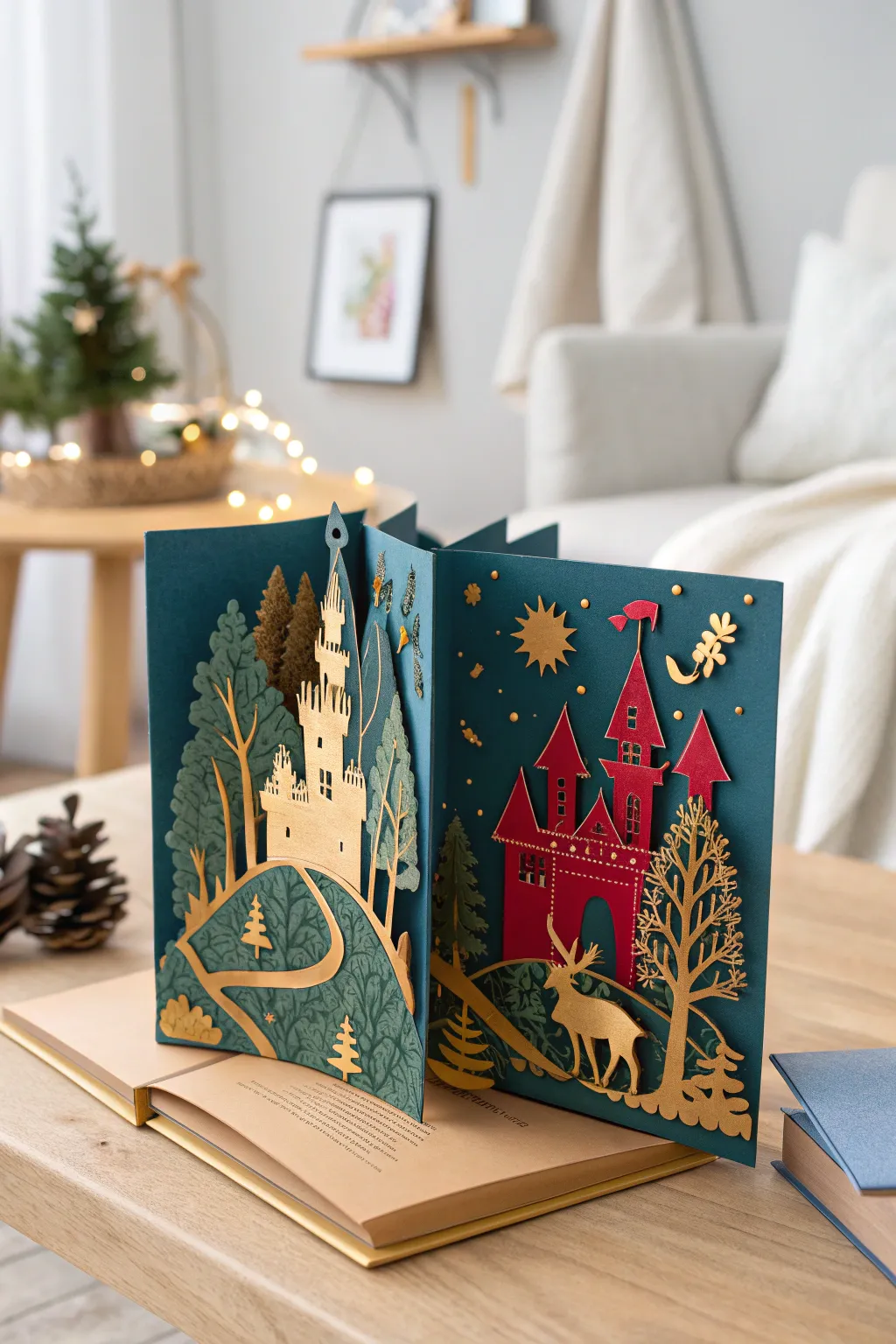Design your card like a mini pop-up book with layered stories. This is great for storytelling; I once did a fairy tale theme, which was a magical touch.