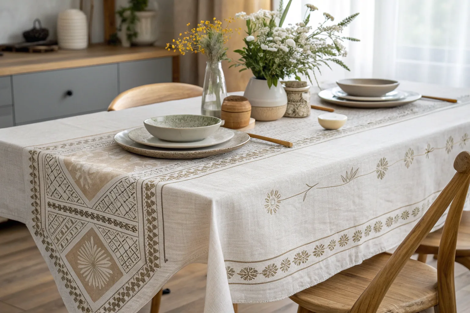 Elevate your dining space with a seasonal tablecloth that blends Scandinavian minimalism with a Boho touch, bringing the beauty of each season to your home.