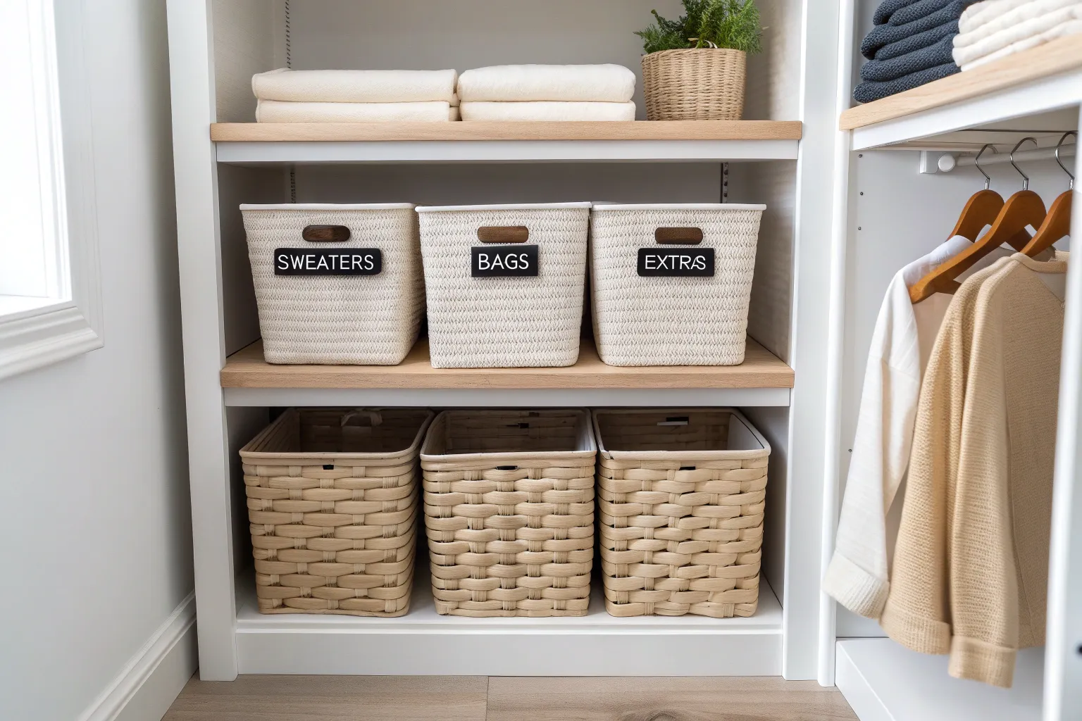 - Nested Seagrass Basket Set: Group similar items together using varied sizes that maintain a cohesive style throughout your closet space.