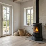 A monochrome greige alcove turns a compact black stove into a dramatic, modern focal point.