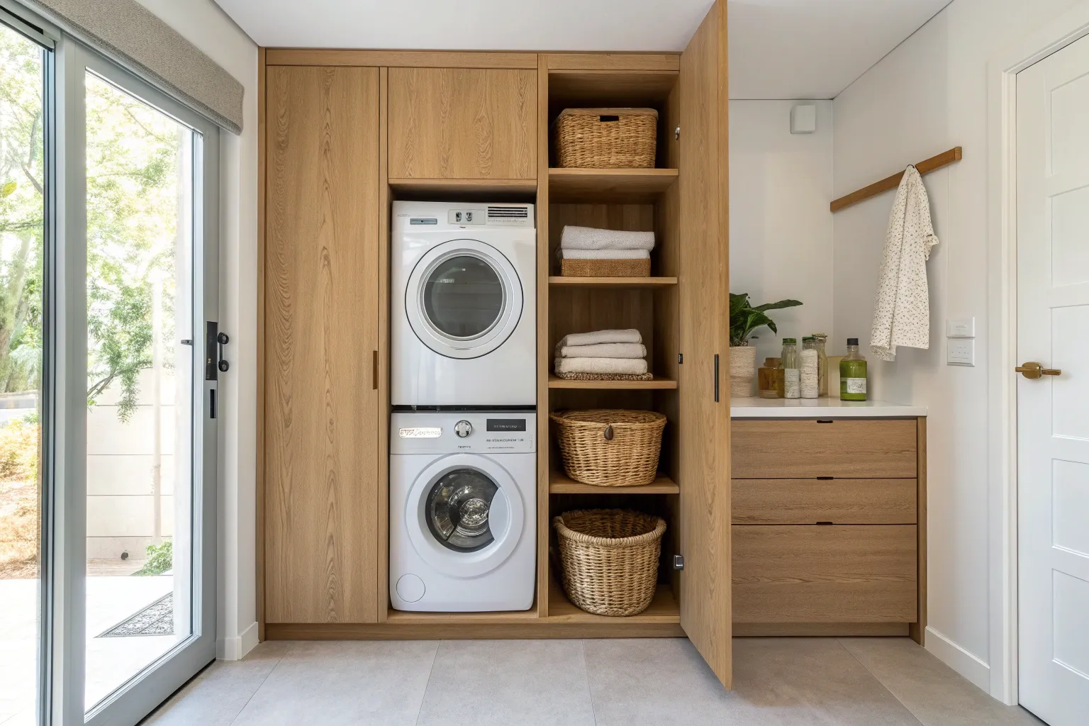 A light-oak folding counter turns side-by-side machines into a calm, built-in laundry zone.