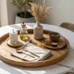 When my decor felt flat, I styled a lazy susan with mixed textures—wood, ceramic, and something woven—plus one pop of greenery. I use this constantly with clients because it reads “designed” even in the tightest spaces.