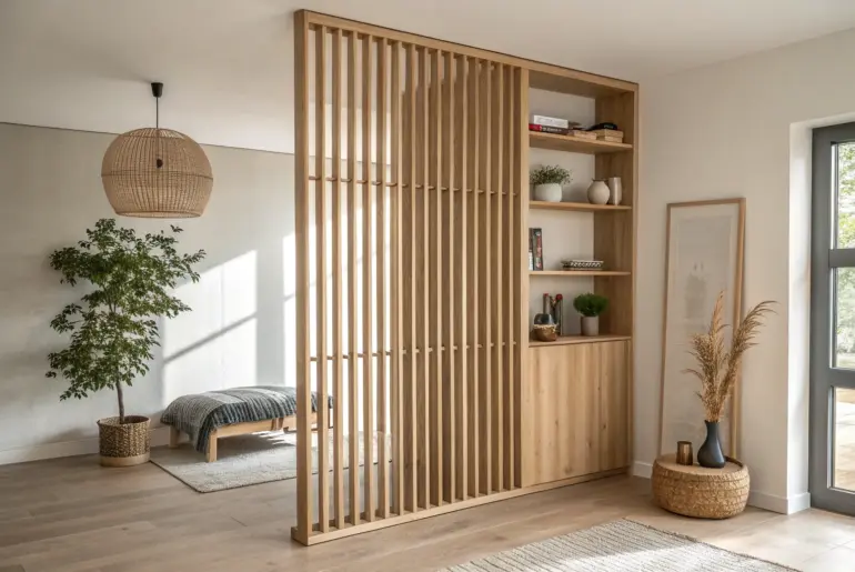 • Freestanding Wood Slat Room Divider: Instantly zone your space with a slatted screen that adds warmth while keeping the room feeling open.